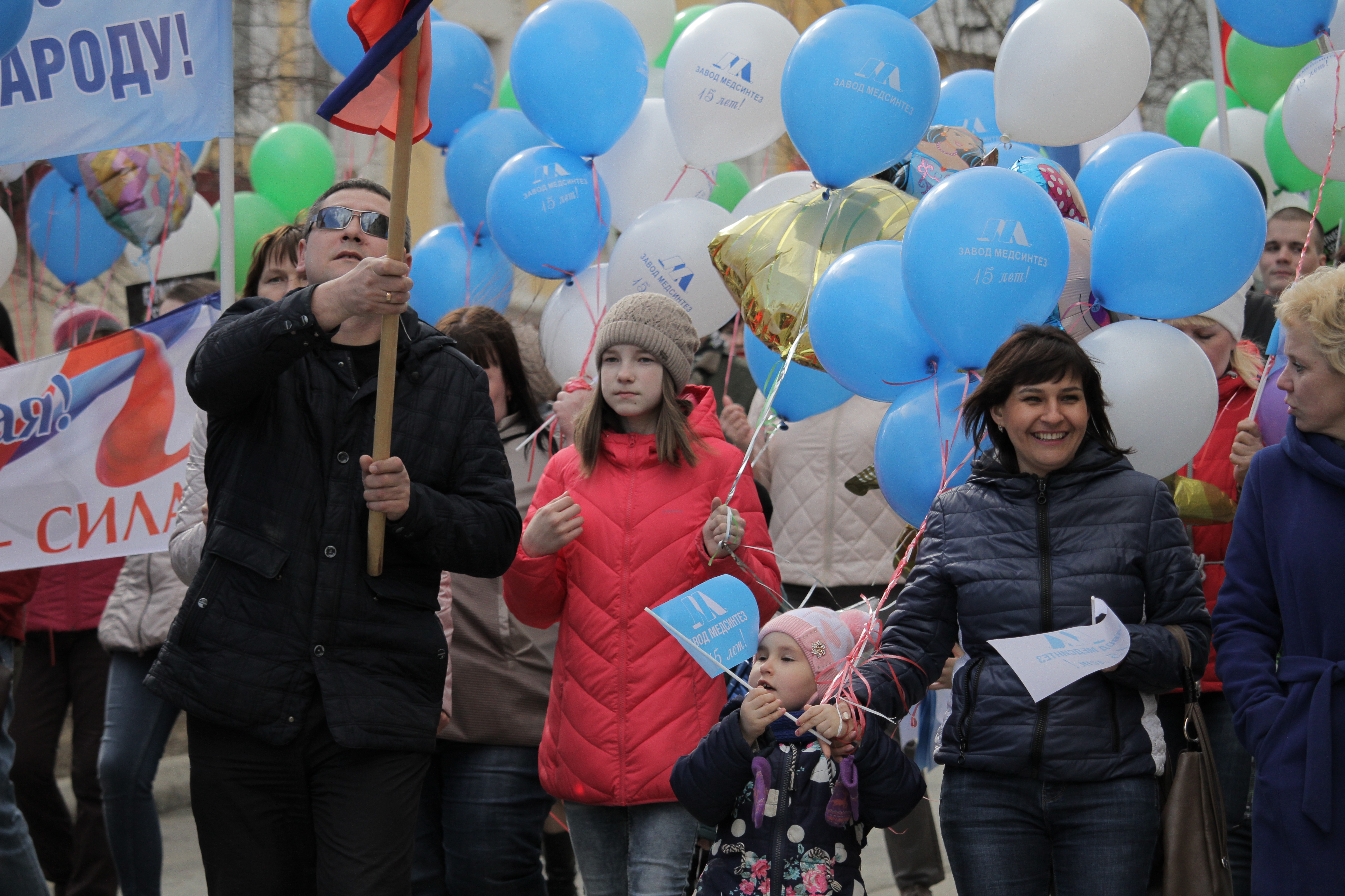 Многие сотрудники завода «Медсинтез» пришли на демонстрацию семьями, передавая таким образом «эстафетную палочку» своим детям и поднимая в них патриотический дух.