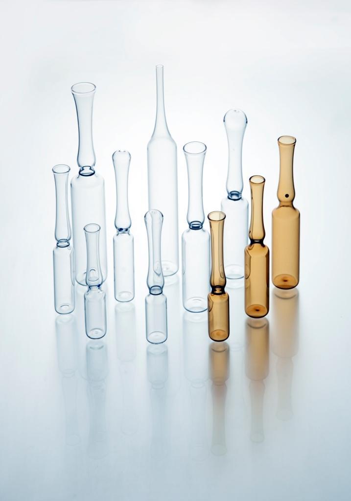 • Ампулы: от 1 до 25 мл, форм В, С, D, Е; из прозрачного и светозащитного стекла, с точкой надлома или кольцом излома, согласно ISO 9187. Существует возможность нанесения маркировочных колец на ампулы.